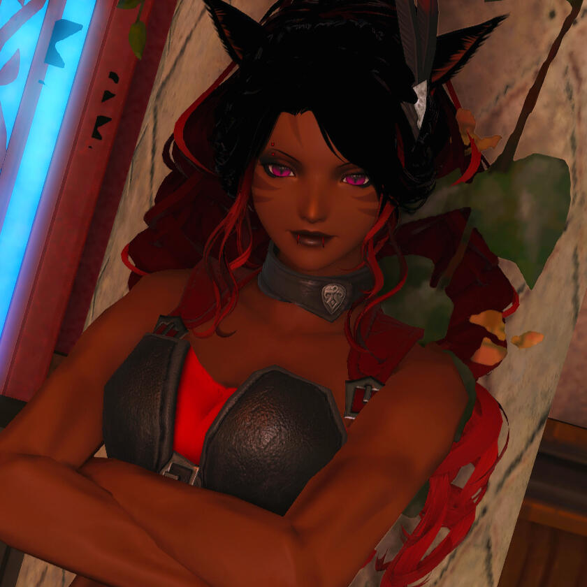 A Seeker of the Sun Miqo'te who was originally born in Gyr Abania but spent most her childhood and young adult life on the streets of Ul'dah. While still bold and prideful the once overly brash and headstrong girl has mellowed out some in recent times and has grown far more calculating and mindful of her actions, specially when others may also be at stake. A spellblade skilled in runic magic and with a strong control over levin she's a force to be reckoned with both in and out of battle, and a great ally to have on your side. Past that though she loves a good drink and is never one to turn down a good time, whether that be going out on some sort of adventure, hitting up a venue, or something a bit more private behind closed doors.